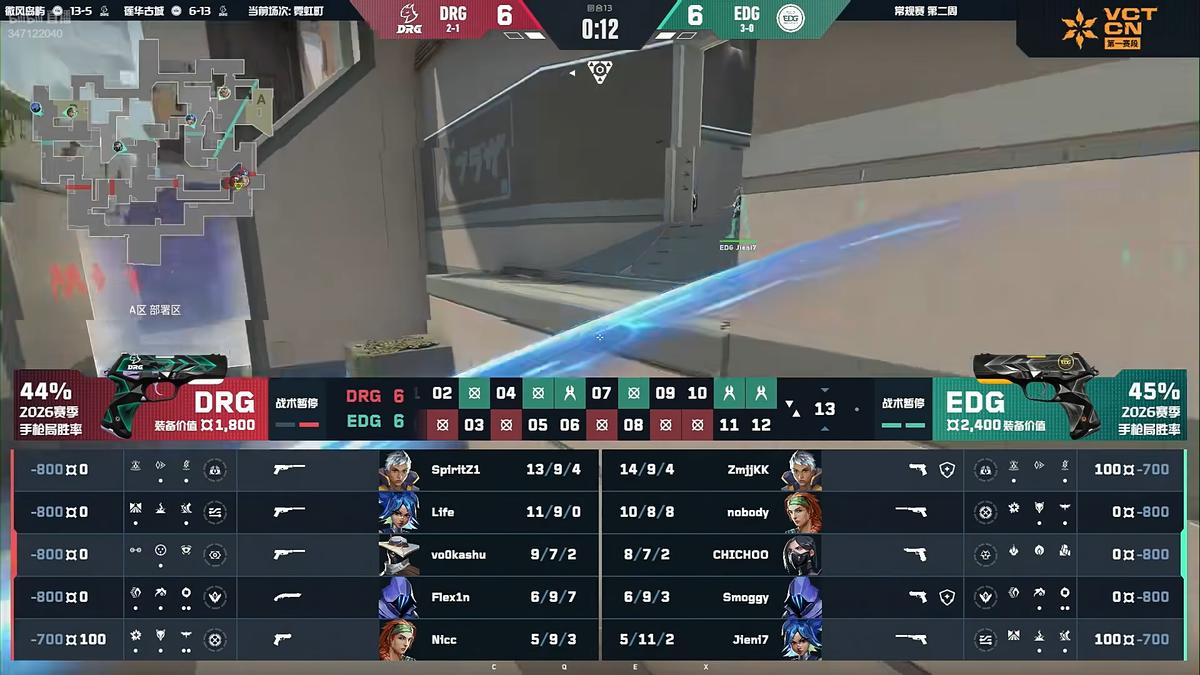 Round five, EDG created a numerical advantage early, and finally Flex1n opted to save, allowing EDG to take this round. Round six, Vo0kashu lost a 1v2 clutch, EDG took another round.