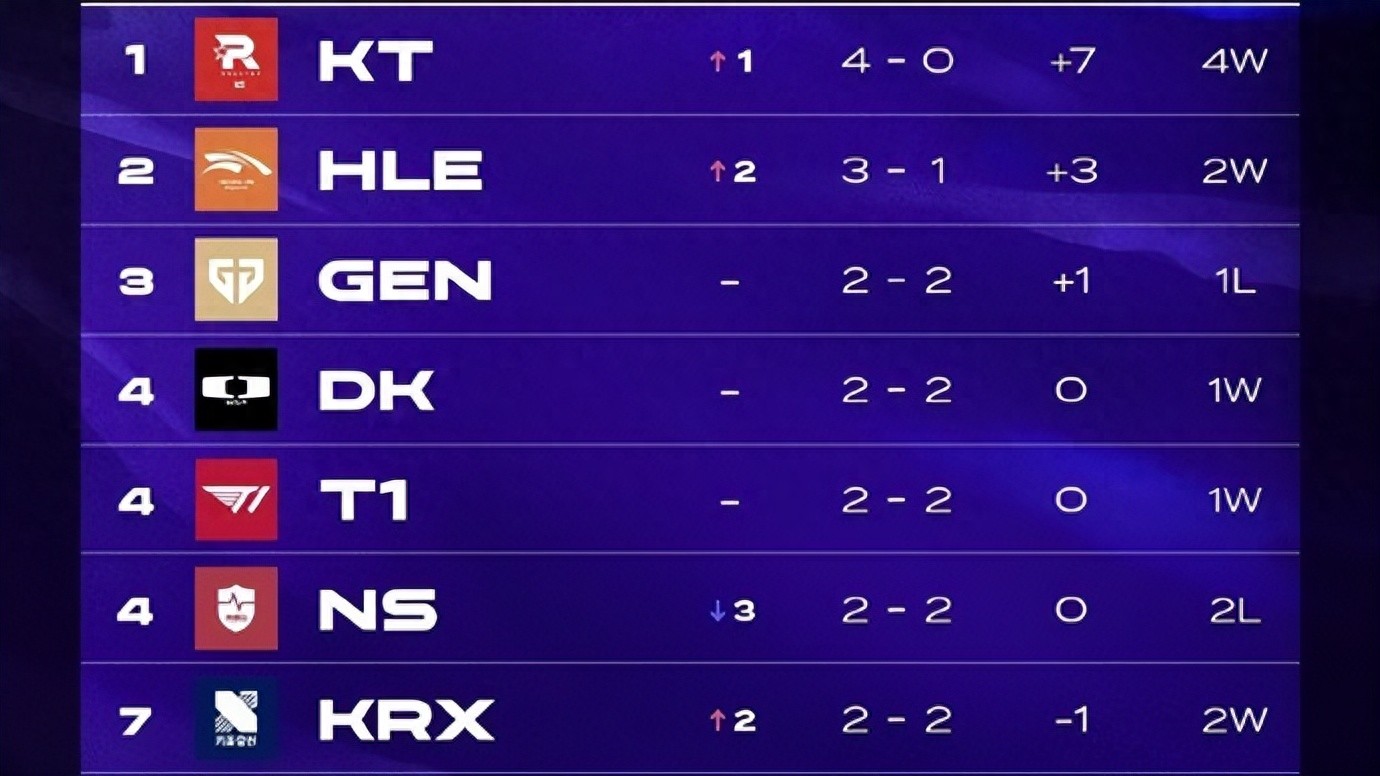 The rankings of LCK teams in this stage have changed significantly, similar to LPL. The domestic powerhouse GEN lost two matches, sharing the same record as DK, NS, and T1. However, because GEN won one more small match, they temporarily rank third. The remaining three teams are tied for fourth place. HLE's performance has also improved this stage, losing only one out of four matches, placing them 3-1 behind KT. The LCK teams for this year's MSI currently seem unpredictable.
