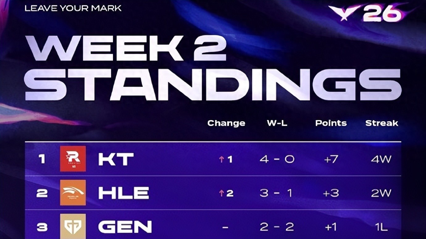 The LCK second-stage regular season, after a two-day break, is about to kick off its second week of matches. This stage of LCK resembles our region somewhat: previously strong teams have collectively underperformed. GEN played four matches and lost two, tying with T1, DK, and NS in standings. Meanwhile, previously underperforming KT and HLE have suddenly surged. KT achieved a four-match winning streak, directly topping the leaderboard, and HLE also posted a 3-1 record.