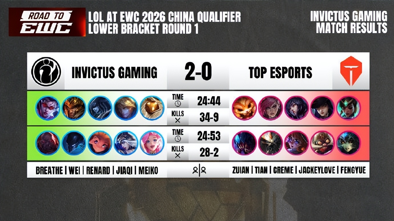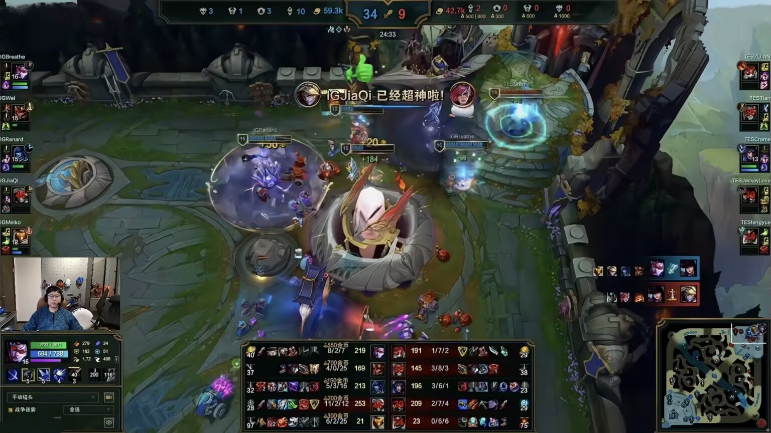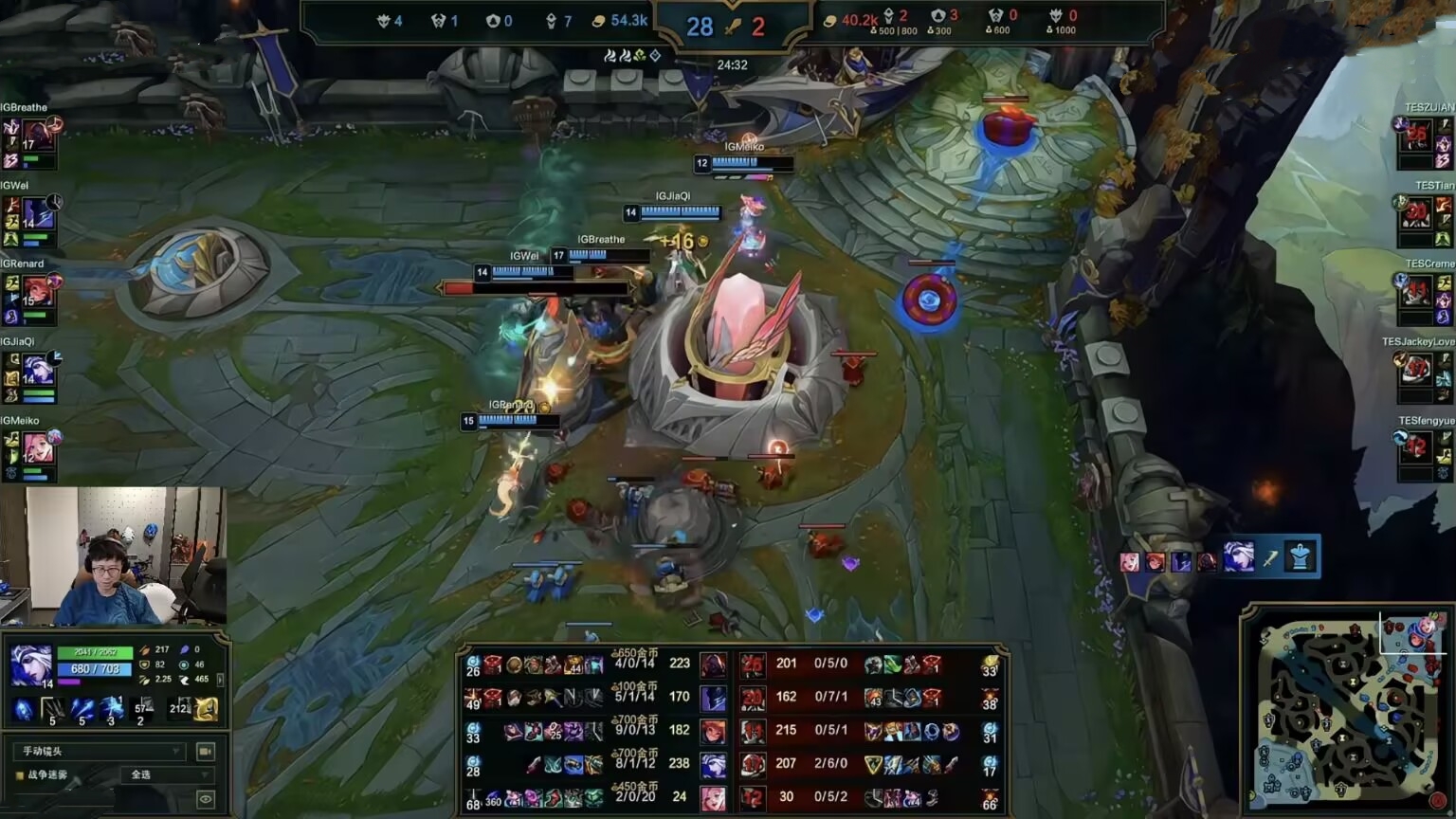 In the first dragon fight, TES collapsed completely, suffering a 1-for-3 trade. At this point, the gold gap wasn't huge yet, but TES lost every subsequent skirmish. With IG's advantage snowballing, their three carries unleashed power that TES couldn't handle. Finally, at 24 minutes, TES's base was destroyed. In the first game, TES struggled a bit early on, but the second game was absurd—all five lanes were simultaneously "spun like a top" by IG.