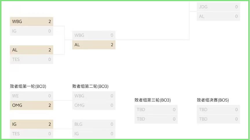 After losing to IG, TES missed the Petroleum Cup. The upcoming matches are also看点. JDG and AL will clash for the first Petroleum Cup spot. WBG, falling into the loser's bracket, got a soft opponent OMG and likely will advance to the third round. Although IG beat TES, their next opponent is stronger: BLG, who surprisingly lost to JDG, will face IG in a major battle—it's unclear who will win this one.