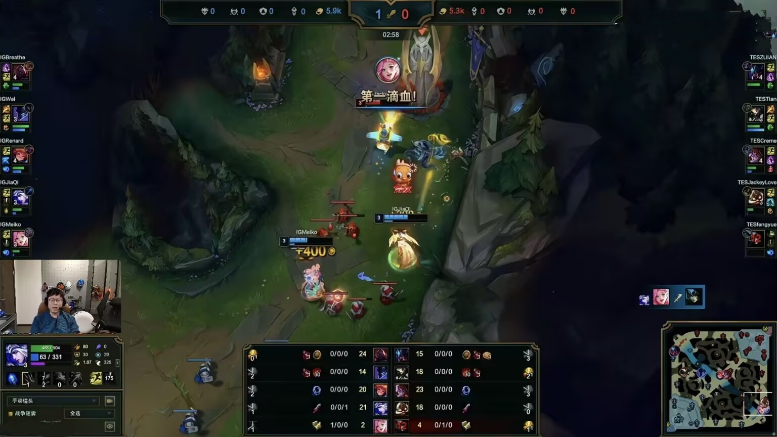 Many fans probably didn't watch the match, so let's briefly recap this BO3. In the first game, IG immediately showed their intent, locking in Vayne for the top lane. Meiko also picked Bard, a champion he's not very proficient with. TES's lineup was more conventional. At the 2-minute mark, Wei's jungle gank bot lane successfully killed "哥哥." Shortly after returning to lane, Fengyue was killed in a lane duel, but Tian arrived promptly and took down IG's duo.