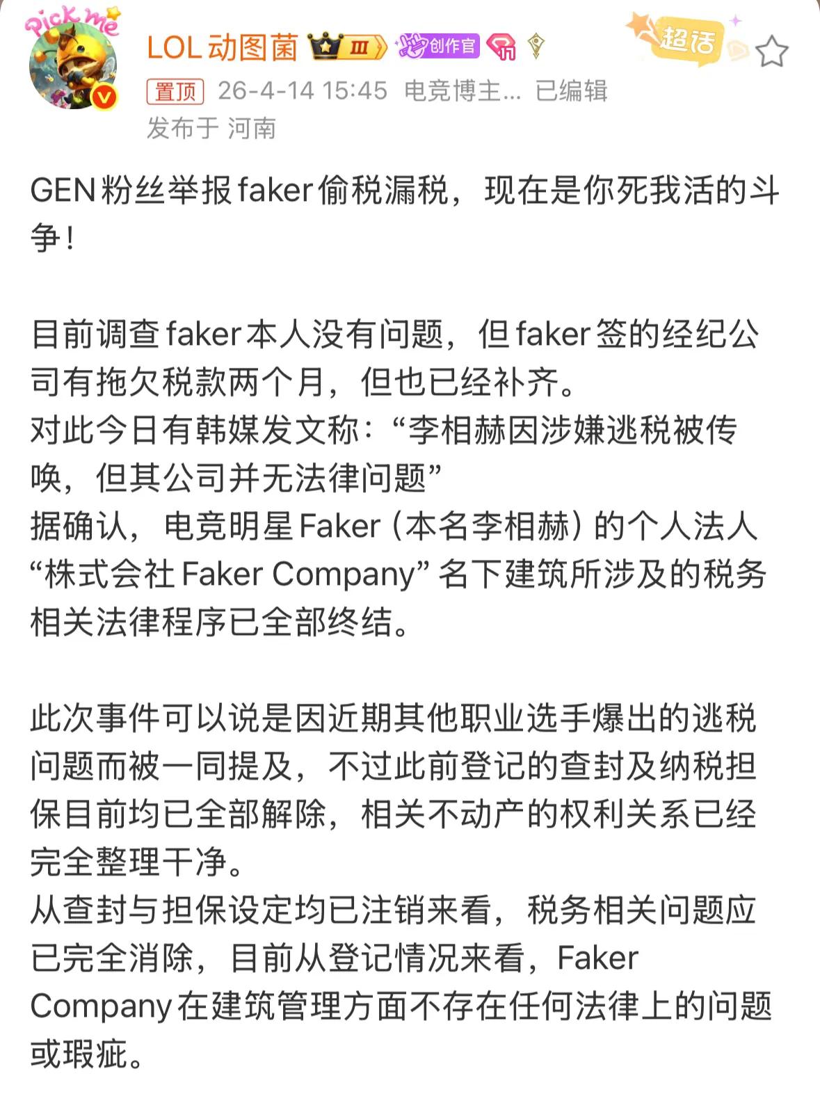 Introduction: The S16 season competition has officially begun, and it is believed that most players have been following the recent matches. The competitions across various major regions are quite intense, and discussions about the LCK region have been particularly frequent these days, especially regarding the GEN team, which recently participated in the Global Pioneer Tournament. As the strongest team in the LCK region, they lost to the G2 team in the competition, prompting an official investigation into match-fixing. Ultimately, no match-fixing issues were found, but instead, Ruler's tax problems were exposed. Recently, GEN fans, in an attempt to divert attention, frantically reported Faker for tax evasion. However, after an official investigation, it was found that Faker had no issues, but his agency had owed taxes for two months, though they have now paid them.