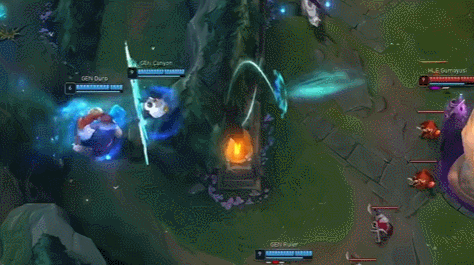 GEN then attempted a counterattack by diving under the tower, but as two players went in, Rell immediately caught them, resulting in another death. The early skirmishes led to a significant deficit in kills, and Duro's Bard, lacking proficiency, made a mistake and gave away one more.