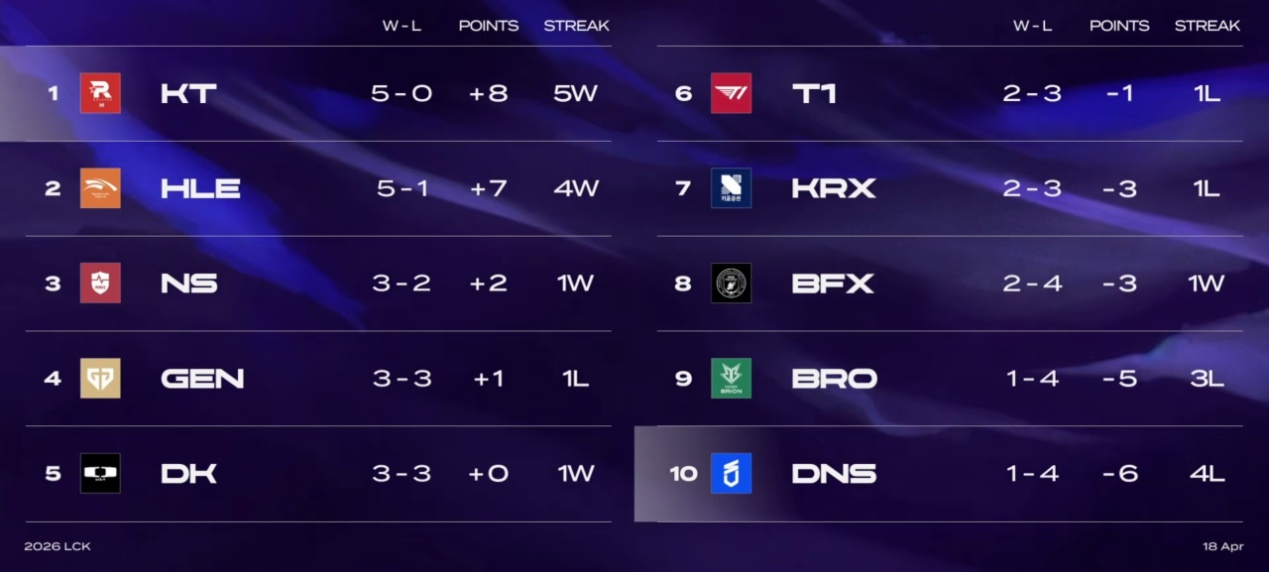 After this loss, GEN's record became 3 wins and 3 losses, already falling out of the LCK top three. Meanwhile, HLE holds a good 5-1 record, ranking second, only behind KT who remains unbeaten with five consecutive wins.