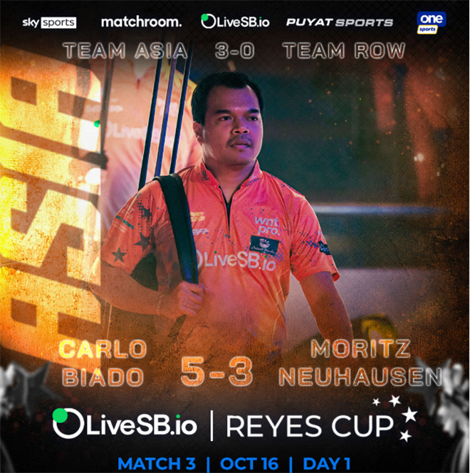 The winning streak began with Carlo Biado, the current world champion. He capitalized on Francisco Sanchez Ruiz’s mistake on the 8-ball in the first rack to secure a 5-1 victory in the opening doubles match. Biado then maintained his impressive form by beating Moritz Neuhausen (Germany) 5-3 in singles, despite struggling at times with three missed break shots. The Filipino cueist finished the match with a stunning 1–9 combo, solidifying the team's advantage.