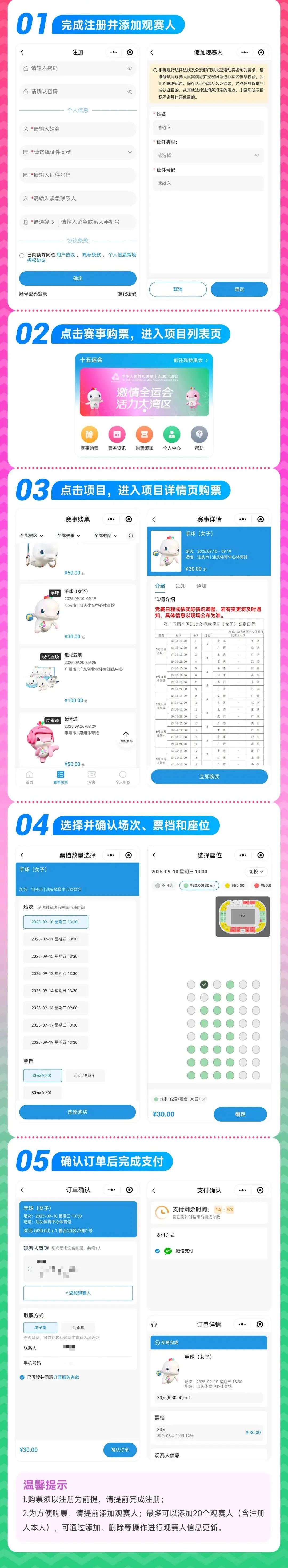 Online options include the official ticket websites and mini-programs for the 15th National Games and Special Olympics; offline options include official ticket sales outlets, venue ticket booths (activated two days before events), and authorized travel agency ticket agents.