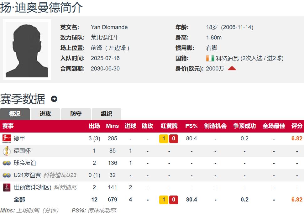 Now 18 years old, Yann Diomandé stands 1.80 meters tall, is right-footed, primarily plays as a left winger, and is contracted with Leipzig until 2030. His transfermarkt value has surged to €20 million, reflecting the usual practice of aligning player value with transfer fees.