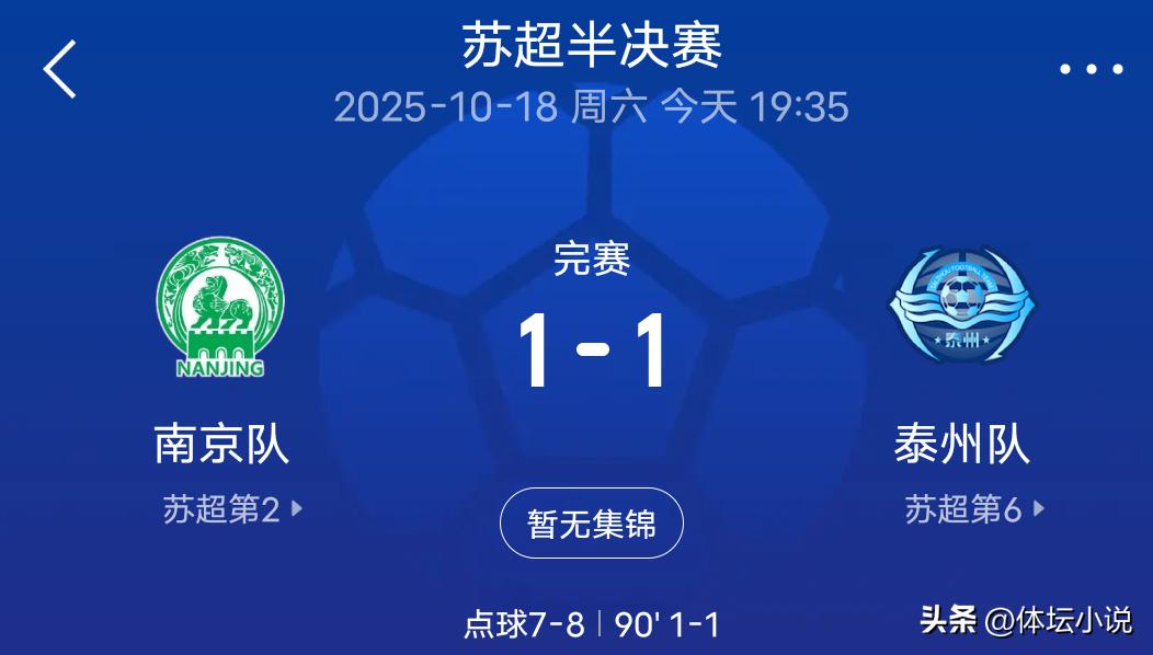 On October 18th Beijing time, the Suzhou Super League semifinals began with high excitement, as the opening game between Nanjing and Taizhou drew an enthusiastic crowd of 60,000. After a fierce battle, the teams ended regular time tied 1-1, leading to a penalty shootout. Ultimately, Taizhou showed superior penalty execution and won 9-8 on aggregate, knocking out Nanjing and pulling off back-to-back upsets to reach the final. It was truly a thrilling and crazy night. The final opponent will be decided between Nantong and Wuxi!