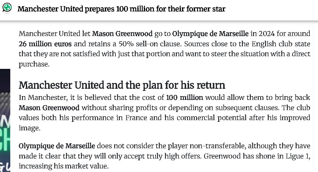 Considering how Manchester United handled Greenwood, he probably does not want to come back either. However, Greenwood’s agent might use the rumors around United to attract interest from other top clubs. The narrative "Manchester United regrets selling him" is a very appealing promotional point. It is said he is more likely to return to La Liga, having previously been loaned to smaller Madrid clubs and Getafe by United.