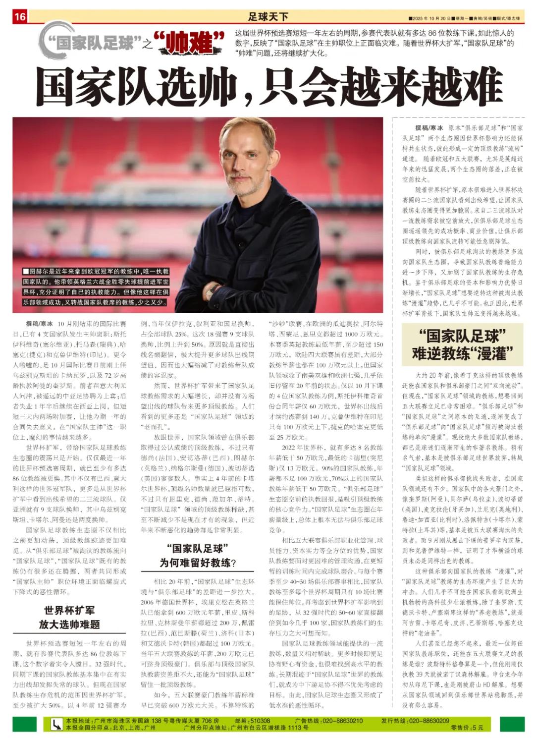 Written by Han Bing During the international break in October, four national teams underwent head coach changes: Stoiković (Serbia), Thomassen (Sweden), Hašek (Czech Republic), and Kluivert (Indonesia). More poignant are Cannavaro, newly appointed Uzbekistan coach before the matches, and Queiroz, aged 72, leading Oman. The former was overlooked in Italy but welcomed by the distant Central Asian federation; the latter returned to West Asia after 18 months unemployed, only to lose the meaning of his one-year contract after two playoff matches in three days. The role of national team coach is increasingly filled with unpredictable events.
