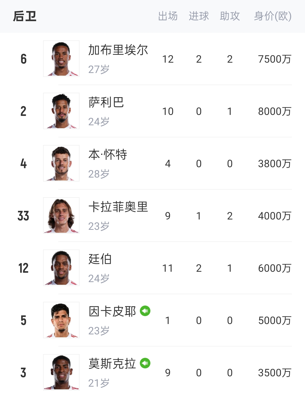 Arsenal's formidable strength is closely linked to their masterful set-piece tactics and their ironclad defensive line. This season, Arsenal's squad includes eight key defenders:Saliba valued at 80 million euros, Gabriel at 75 million, Timber at 60 million, Incapier at 50 million, Skele at 45 million, Carafiori at 40 million, Ben White at 38 million, and Mosquera at 35 million.The combined value of Arsenal’s eight defenders totals an impressive 423 million euros, exceeding the squad value of many entire teams in the big five leagues. With such defensive depth, Arsenal is well-equipped to compete on multiple fronts.