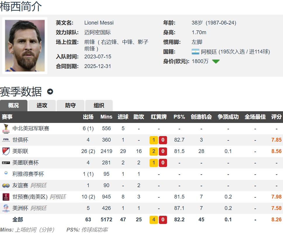 Messi joined Inter Miami in the summer of 2023 on a free transfer, beginning his MLS journey. Soon after, his longtime Barcelona friends under 40—Busquets, Alba, and Suarez—also joined the team. The four of them collaborated to help the club winthe Leagues Cup titleandthe Supporters’ Shield. To date, Messi has appeared in82 matches, scoring 71 goals and providing 37 assists, demonstrating remarkable efficiency and personally earning the2023-24 MLS Most Valuable Player award.