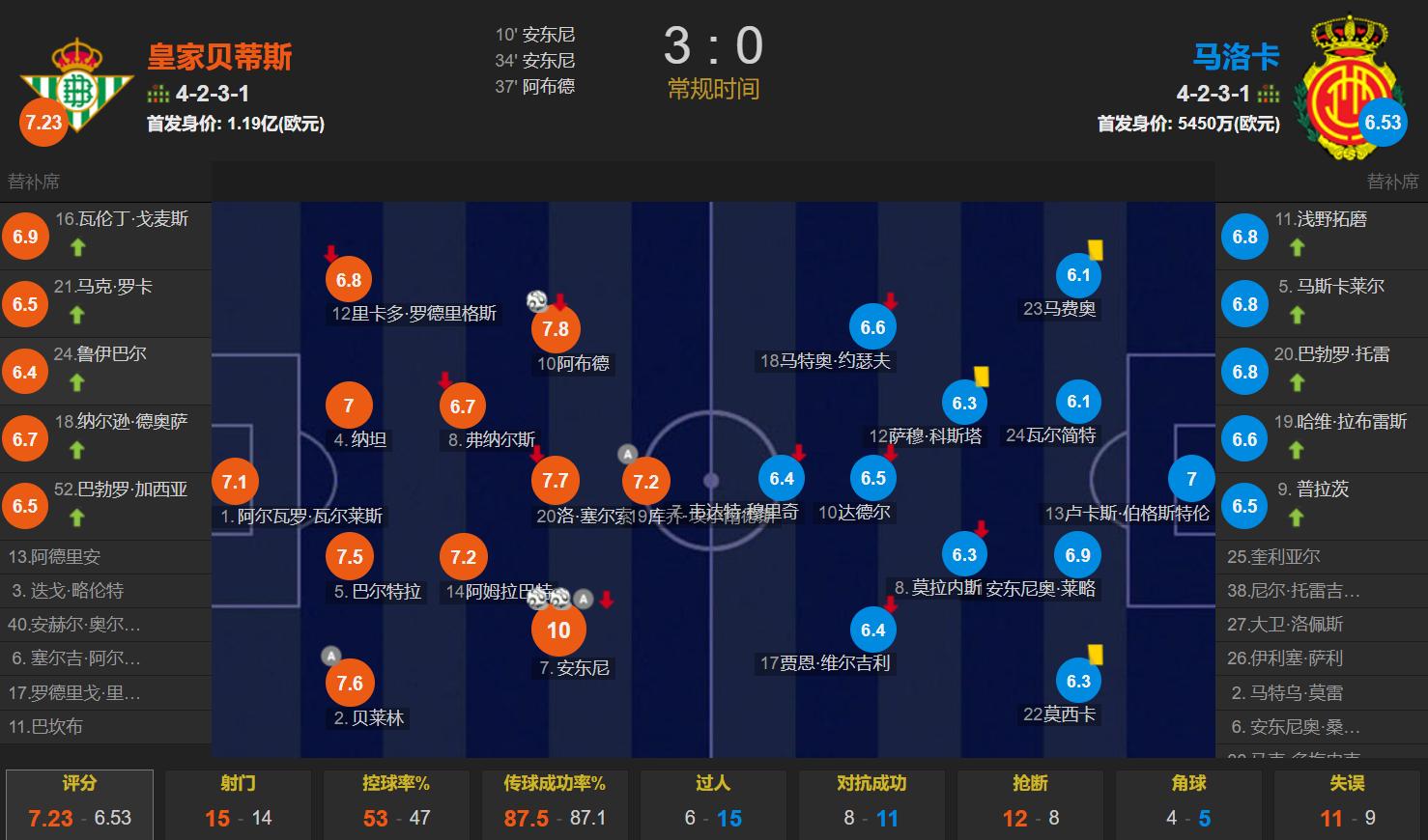 In this match, Antony started and played 83 minutes before being substituted. He scored twice assisted by Cujo and Bellerín in the 10th and 34th minutes respectively, and then set up teammate Abud in the 37th minute to seal the victory. Ultimately, Real Betis won 3-0 at home against Mallorca, with Antony involved in all three goals, delivering an outstanding 2 goals and 1 assist performance. After the game, Antony earned the highest rating of 10 (full marks), the only player in La Liga this round to achieve a perfect score.