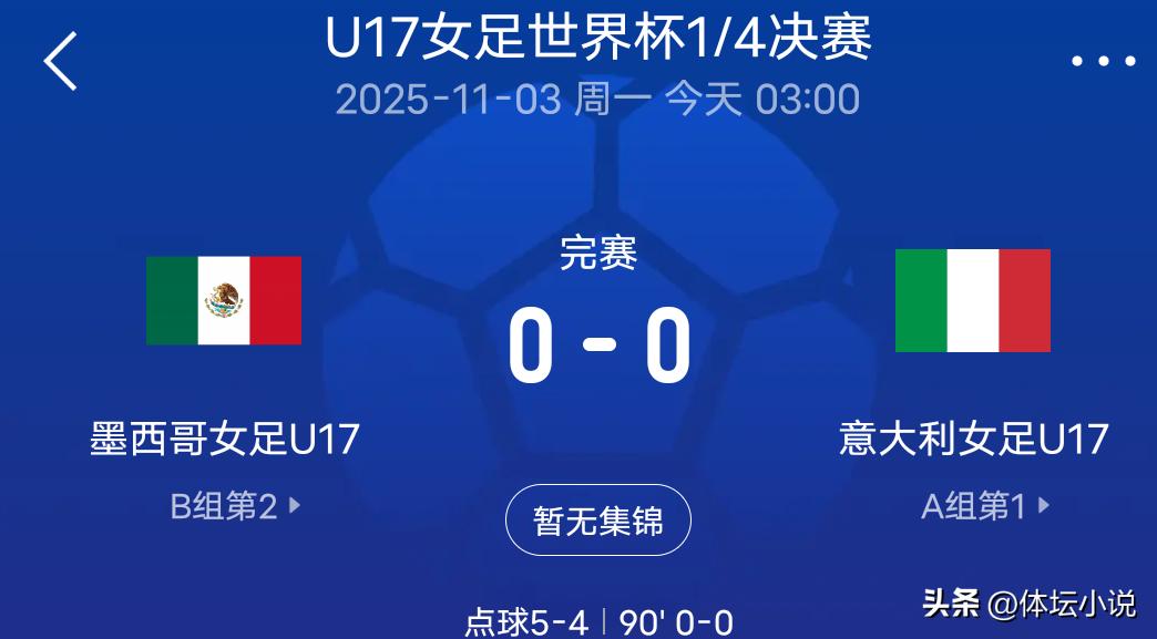 On November 3rd Beijing time, the U17 Women's World Cup quarterfinals proceeded, creating an electrifying evening featuring two penalty shootouts. The Netherlands edged out France 9-8 on penalties, and Mexico overcame Italy 5-4. Thus, the tournament’s semifinalists are confirmed as Brazil, North Korea, the Netherlands, and Mexico, with the Americas taking home two semifinal berths!