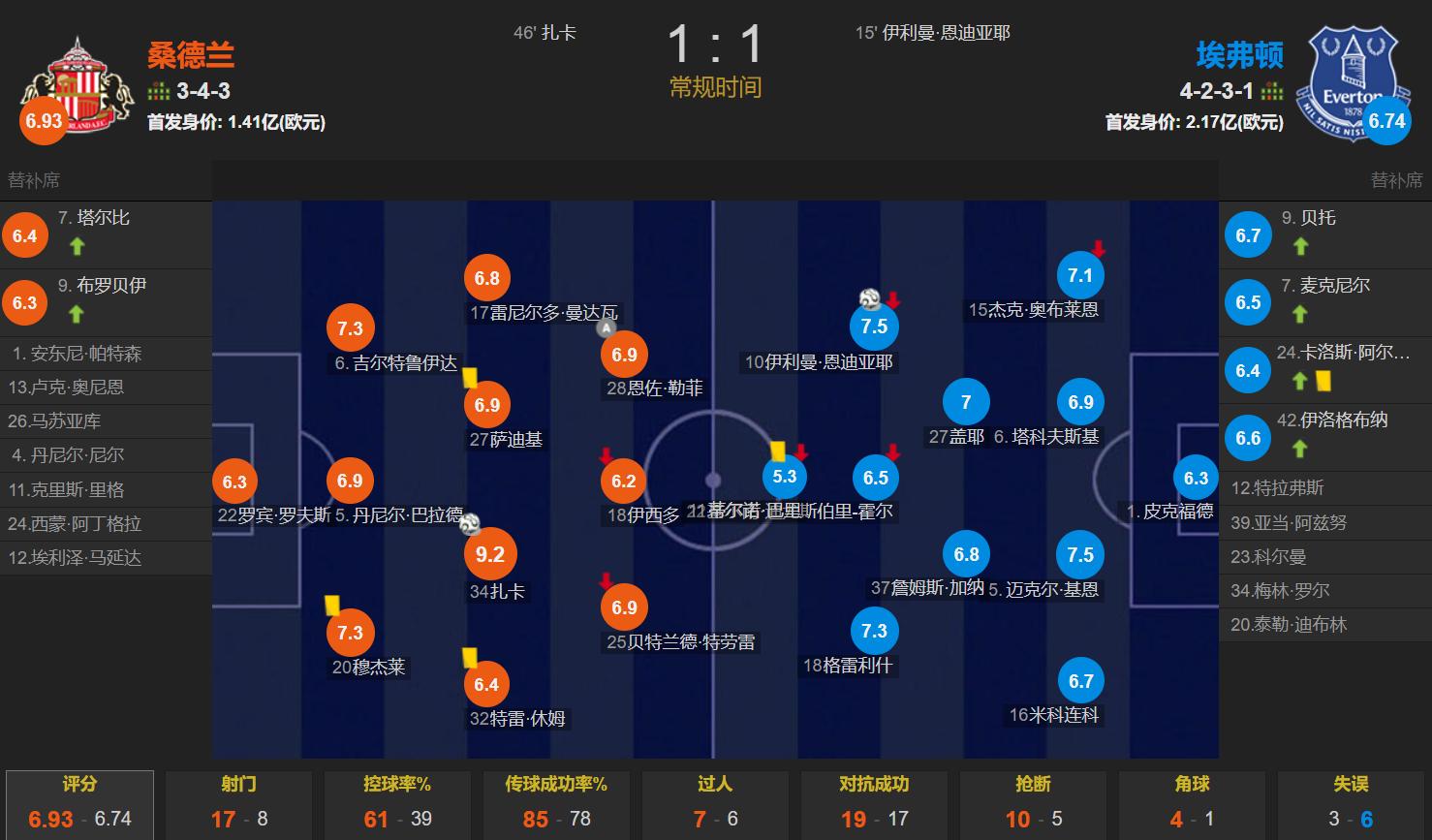 In the first half, Ghana’s early shot caused danger, and Ndiaye broke the deadlock for Everton. Barry missed a great chance in front of goal, leaving Sunderland trailing 0-1 at halftime. In the second half, Xhaka’s shot leveled the score for Sunderland, while Keane’s handball in the penalty area went unpunished by the referee, allowing Everton to escape a crucial penalty.