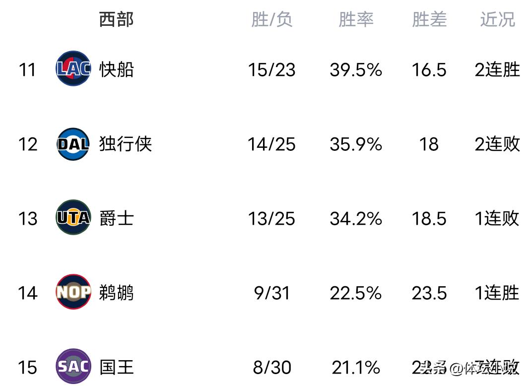 On January 12th Beijing time, the NBA regular season continued with several games concluding yesterday. Among them, the Timberwolves lost a high-scoring battle 134-146 to the Cavaliers, the Clippers overcame a 19-point deficit to win 98-92 and complete a sweep of the Pistons, the Spurs held firm to beat the Celtics 100-95, the Mavericks performed poorly and suffered a heavy 107-125 loss to the Bulls, and the Hornets crushed the Jazz 150-95 with overwhelming force. As a result, the updated leaderboard shows the Spurs in second place, the Timberwolves fourth, the Clippers eleventh, and the Jazz thirteenth!