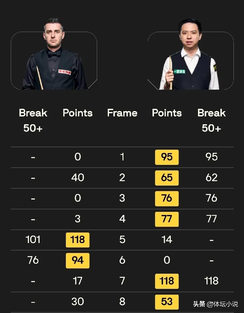 Wu Yize faced Murphy. Against the world number seven and defending champion Murphy, Wu Yize’s offensive form wasn’t great, but surprisingly Murphy’s performance was even worse, riddled with basic errors and inconsistent play, failing to score a single 50+ break. Wu Yize, meanwhile, maintained steady form, producing one century break and one 50+ break to comfortably defeat Murphy 6-2 and advance to the quarterfinals. Winning on his Masters debut was truly impressive!