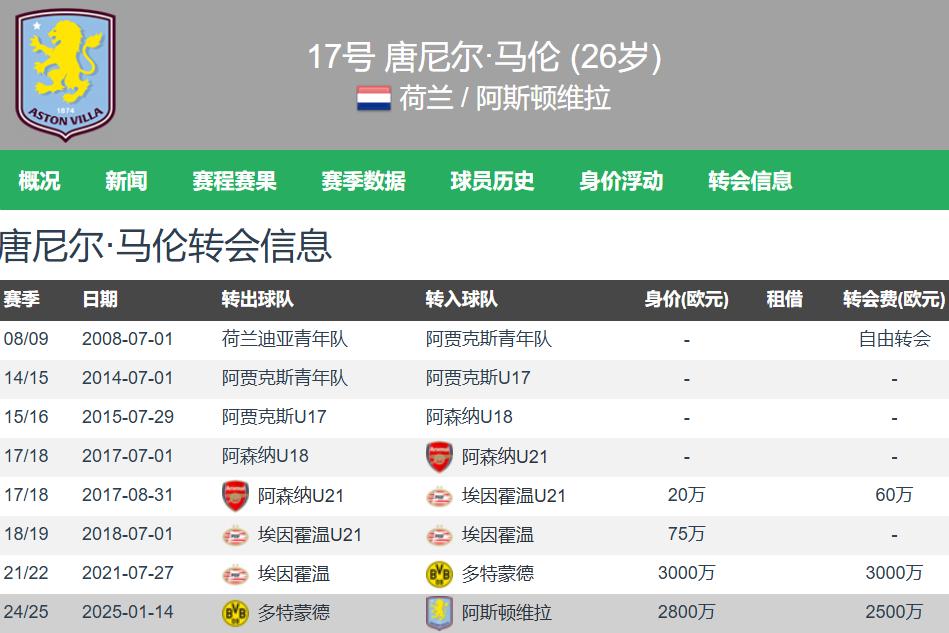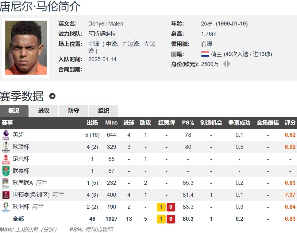 Malen is currently 26 years old, stands 1.76 meters tall, is right-footed, and can play multiple attacking positions. Transfermarkt values him at €25 million. So far this season, Malen has appeared 29 times for Aston Villa across all competitions, starting 11 times, totaling 1106 minutes with 7 goals and 2 assists; in the Premier League, he has played 21 matches (only 5 starts), totaling 644 minutes with 4 goals and 1 assist.