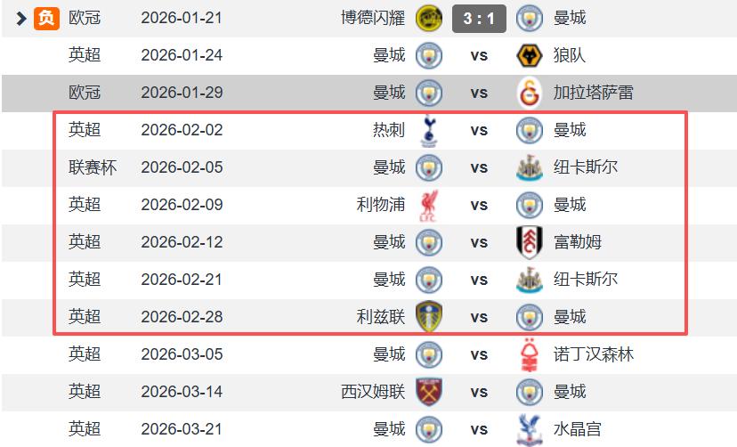 Manchester City is currently competing on four fronts,In February, they have five Premier League matches, one second-leg semi-final in the League Cup at home against Newcastle, and an FA Cup fourth-round home game against Salford City, totaling seven matches. If the two-legged Champions League qualification playoffs are included, the total rises to nine matches.Therefore, whether Manchester City can finish in the Champions League top eight is crucial for their upcoming schedule. Given City's current form, even the eighth-round home match against Galatasaray may not guarantee a full three points. And even if they win, it depends on other teams' results, as after the seventh round’s matches, City is very likely to fall out of the top eight. Guardiola’s repeated upsets have already undermined City’s stability as a top team.