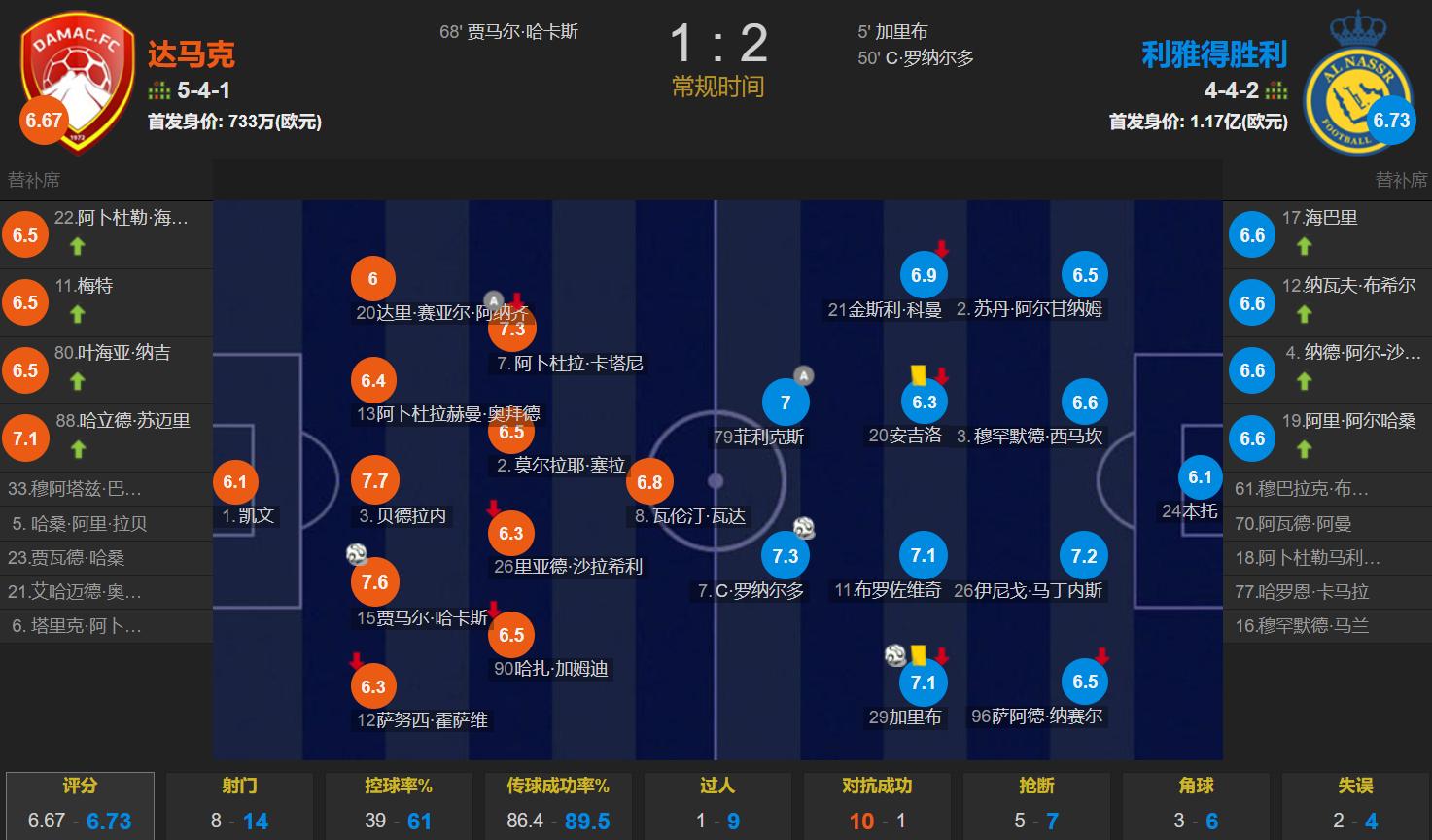 Throughout the match,Al-Nassr held 61% possession, took 14 shots with 4 on target; Damac managed 8 shots with 3 on target.Ronaldo-led Al-Nassr barely edged past relegation-threatened Damac, illustrating that aside from dominating lower-tier AFC Champions League opponents, winning other titles will remain a tough challenge given their overall team strength!