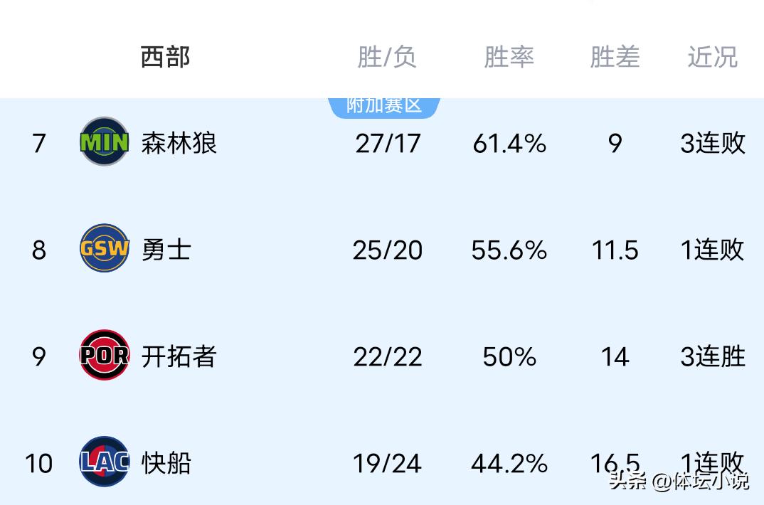 On January 22nd Beijing time, the NBA regular season progressed with several games finishing yesterday. The Timberwolves fell 122-127 to the Jazz in a heartbreaking comeback loss, the Lakers edged out the Nuggets 115-107 in a close comeback victory, the Raptors powered past the Warriors 145-127 with balanced scoring, and the Heat comfortably defeated the Kings 130-117. Consequently, the newest Western Conference rankings show the Nuggets in third place after two losses, the Lakers fifth with two wins in a row, the Timberwolves seventh following three straight defeats, and the Warriors in eighth place!
