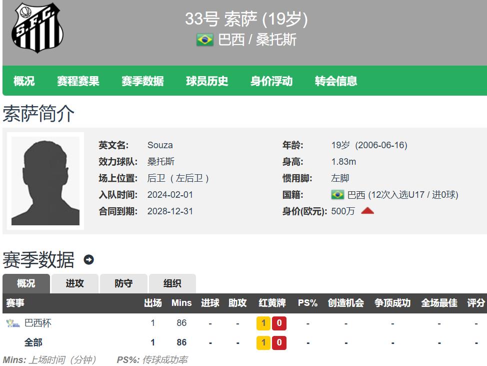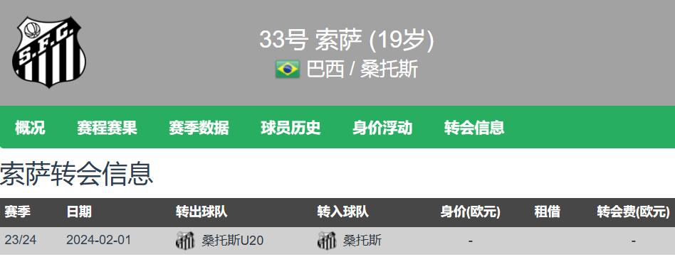 According to official announcements from Premier League Big Six club Tottenham, the team has secured a long-term deal with 19-year-old Brazilian full-back Sosa from Santos. Previously, Romano reported that Tottenham paid a transfer fee of €15 million for Sosa, whose market value on Transfermarkt is €5 million.