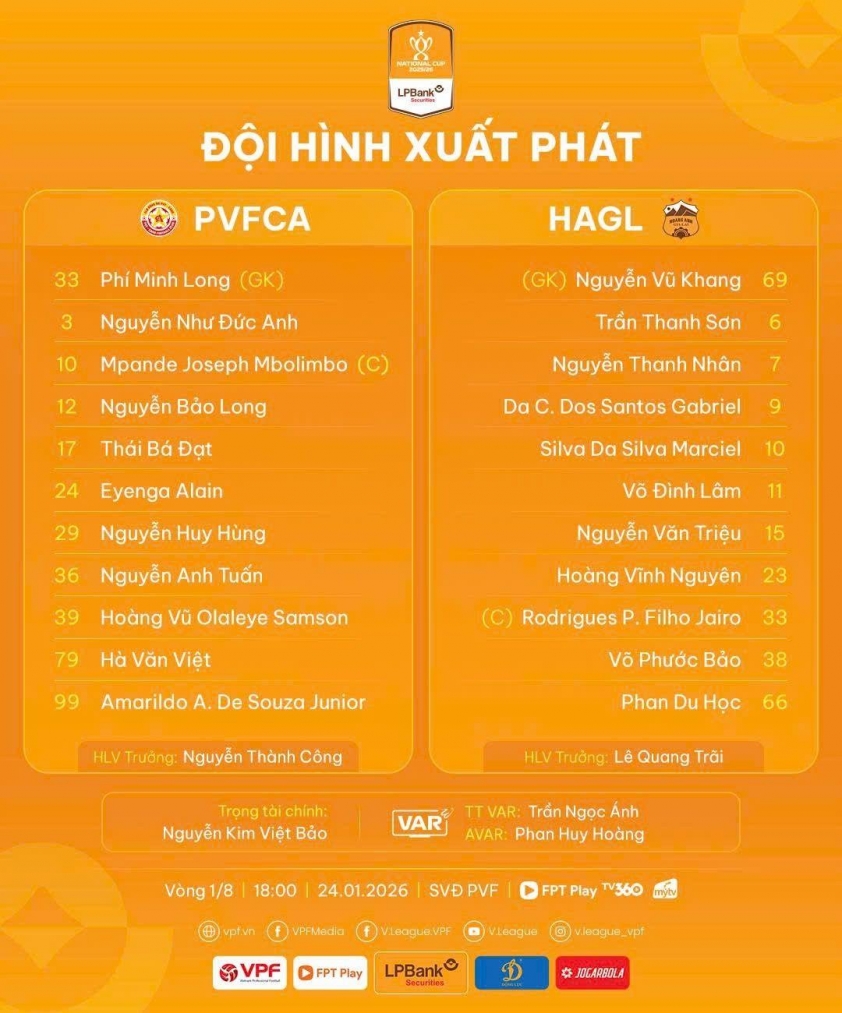 The 2025/26 National Cup now awaits only the outcome of the late Round of 16 match between PVF-CAND and HAGL, scheduled for 6:00 PM on January 24, to finalize the lineup for the quarterfinals. After a period of preparation, both teams enter the contest determined to secure a spot in the next round, promising an intense and exciting competition.