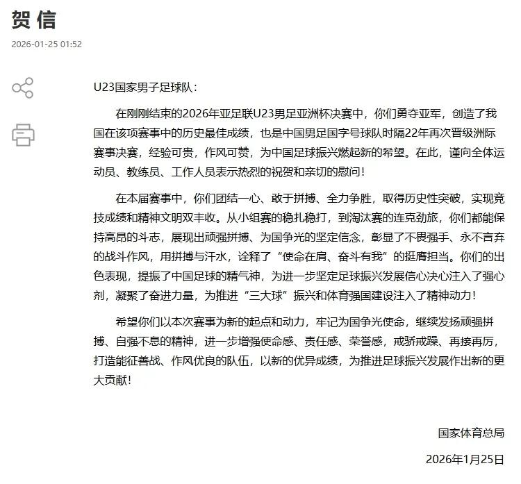 Immediately after the match, the Chinese Football Association and the General Administration of Sport sent congratulatory letters. The letter from the General Administration stated: In this tournament, you united as one, dared to fight, and strived for victory, achieving a historic breakthrough and excelling both in competition and sportsmanship. From steady group stage performances to defeating strong teams in knockouts, you maintained high morale, demonstrated tenacity and patriotism, showing a fighting spirit that fears no strong opponent and never gives up. Through your efforts and sweat, you embodied the responsibility and commitment of “bearing the mission, striving with me.” Your outstanding performance uplifted the spirit of Chinese football, injected confidence and determination into the football revitalization effort, gathered momentum for advancing the “three major balls” revival and building a strong sports nation! We hope you take this tournament as a new starting point and motivation, remember your mission to bring glory to the country, continue to promote the spirit of perseverance and self-improvement, further strengthen your sense of mission, responsibility, and honor, remain humble and diligent, and build a team capable of fighting and with excellent style, making new and greater contributions to football development.