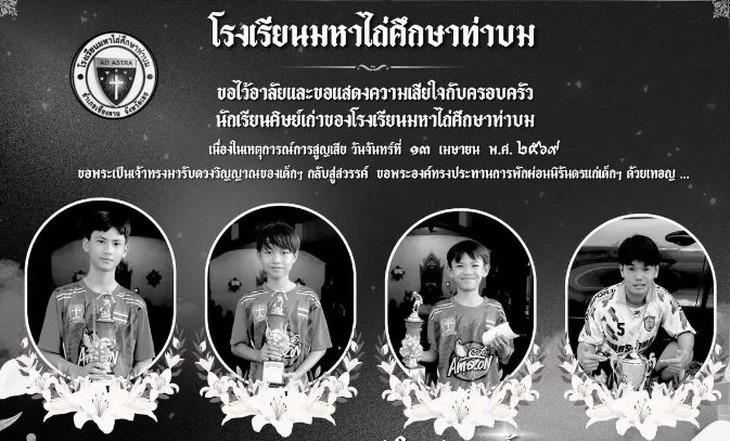 The identities of the four victims are Pattarapong Kanyaprasit (14 years old), Pongpipat Srikhum (14 years old), Chawanakorn Budda (13 years old), and Kittikun Budda (16 years old). All were talented young football players, having studied at Mahathai Suksa Thabom school and were considered to have bright futures in football.