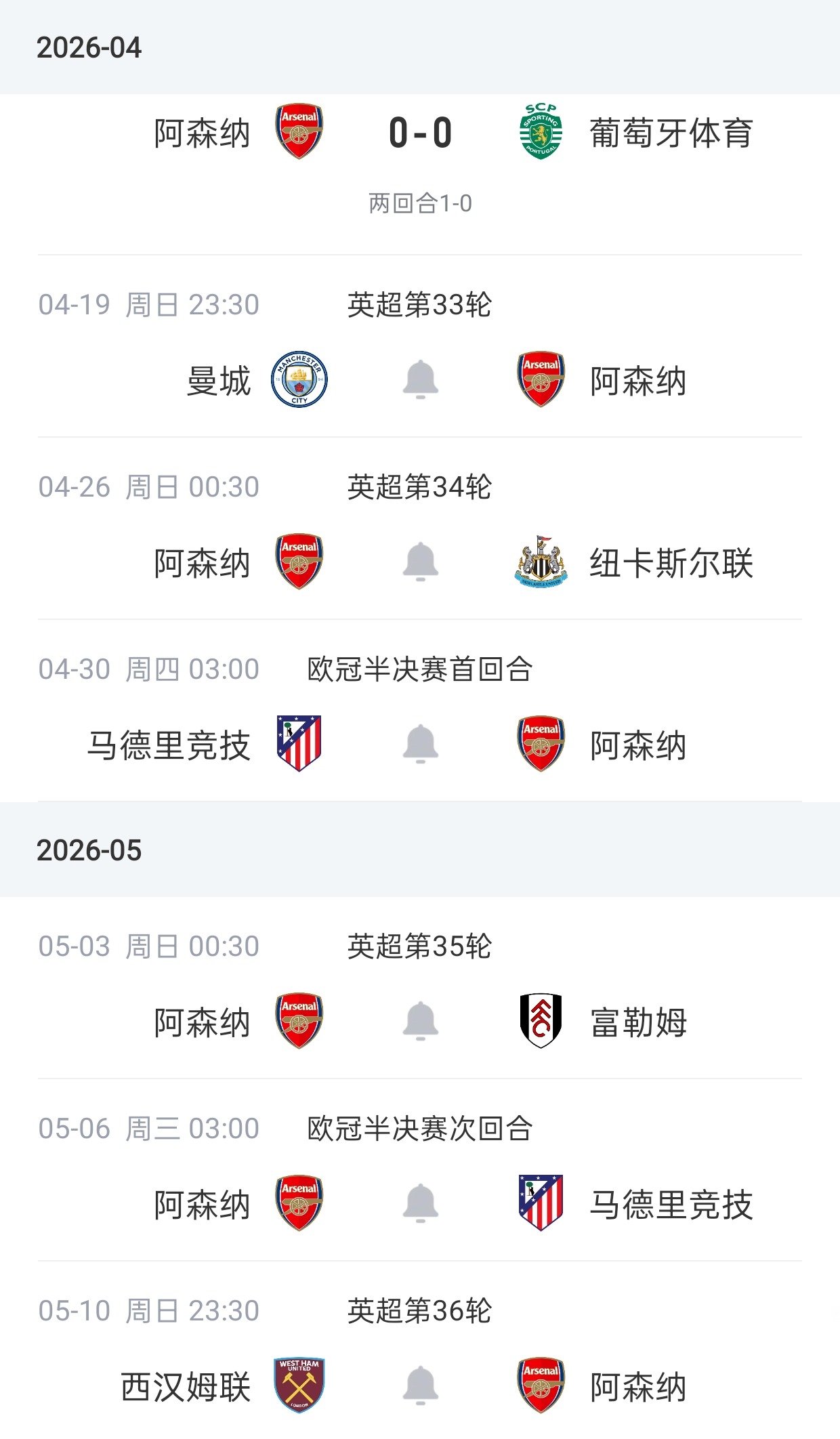 Top European clubs face difficulties with dual campaigns, balancing Champions League progression with league title pursuits. In the Champions League quarter-final second leg, Arsenal drew 0-0 at home against Sporting Portugal, advancing to the semi-finals with a 1-0 aggregate and will meet Atlético Madrid. Arsenal's attack was quite poor in that match, but they progressed. This weekend, on April 19 at 23:30 Beijing time, in Premier League Round 33, they face a crucial title-deciding clash as Manchester City hosts Arsenal.