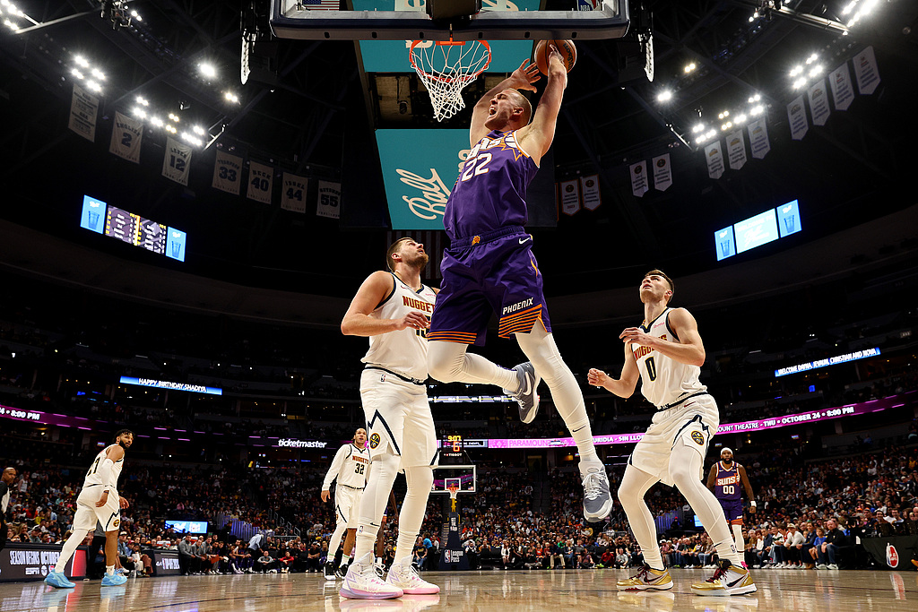 In the first quarter, Nikola Jokić showcased his dominance inside, making all four of his attempts near the basket and converting three. With his drawing attention and playmaking, other Nuggets players also fired up. They hit five three-pointers from outside, scoring 33 points for the quarter. The Suns, lacking their core leaders, relied more on individual offensive efforts. Their scoring focus was mainly from beyond the arc, shooting 5-of-12 on threes at a rate close to 60%, but they were completely outmatched inside. By the end of the first quarter, the Nuggets had built a 7-point lead.