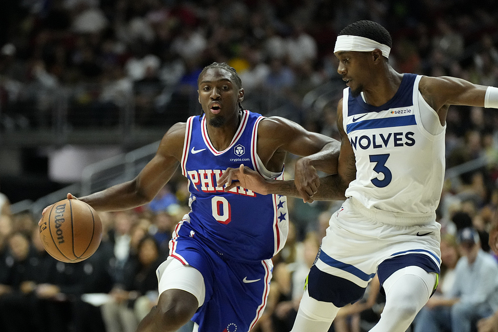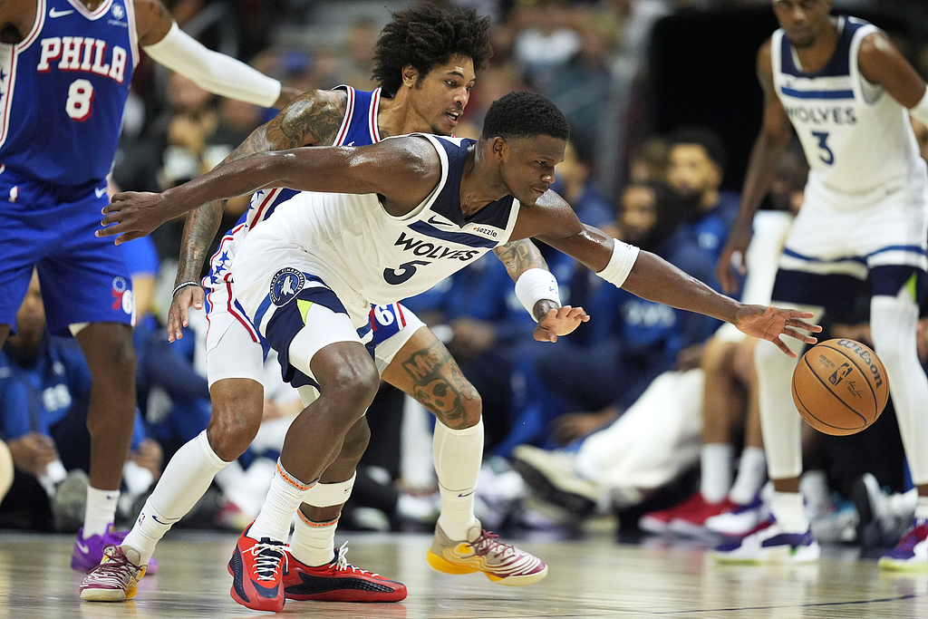 NBA preseason continues, with a key matchup between Eastern and Western Conference teams taking place as the Minnesota Timberwolves face the Philadelphia 76ers. The Timberwolves made a major trade during the offseason, sending away Towns and acquiring Randle, DiVincenzo, Jeffries, and a first-round pick from the Pistons from the Knicks. In their previous game, the Timberwolves defeated the Lakers 124-107, securing their first preseason victory. In this game against the 76ers, star player Edwards was active, and new acquisition DiVincenzo also started, joining McDaniels, Reid, and Conley in the starting lineup. For the 76ers, George, Maxey, Martin, Oubre, and Drummond teamed up to take the field.