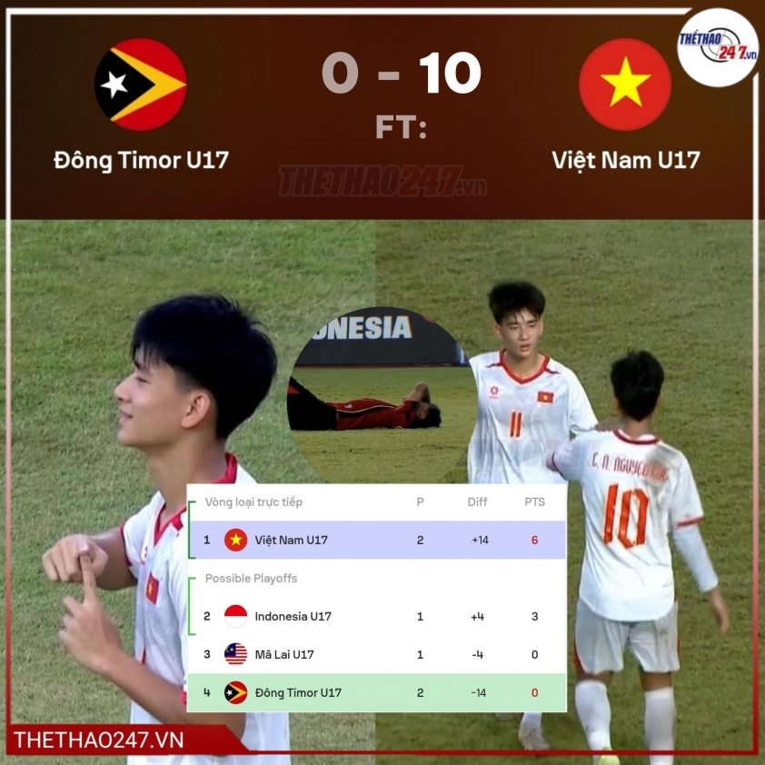 With this win, Vietnam U17 has 6 absolute points after two matches, also possessing a superior goal difference of +14. In the final match, coach Cristiano Roland's team will face host Indonesia U17 on April 19 in a decisive match for the top spot in Group A as well as the semifinal ticket.