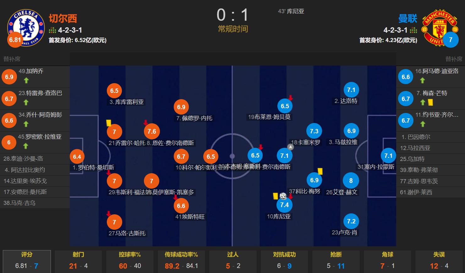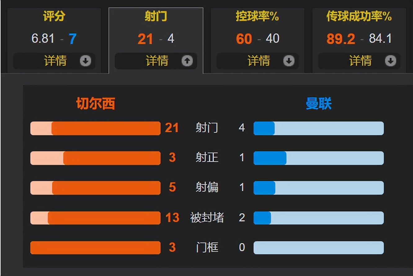 In this match, Chelsea dominated at home but couldn't score, with a possession rate as high as 60%, firing 21 shots, but only 3 were on target; Manchester United scored the winning goal with just one shot on target throughout the game, a stark contrast. Rosinier was also helpless, tactics were set, but the attack lacked potency, Chelsea's 21 shots couldn't yield a single goal.