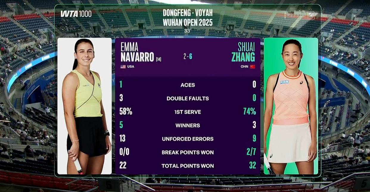 A year later, the two met again at the Wuhan Open. Before the match, many predicted that if Zhang could defeat Navarro, based on last year’s China Open performance, Shuai’s results at Wuhan would likely be quite strong.