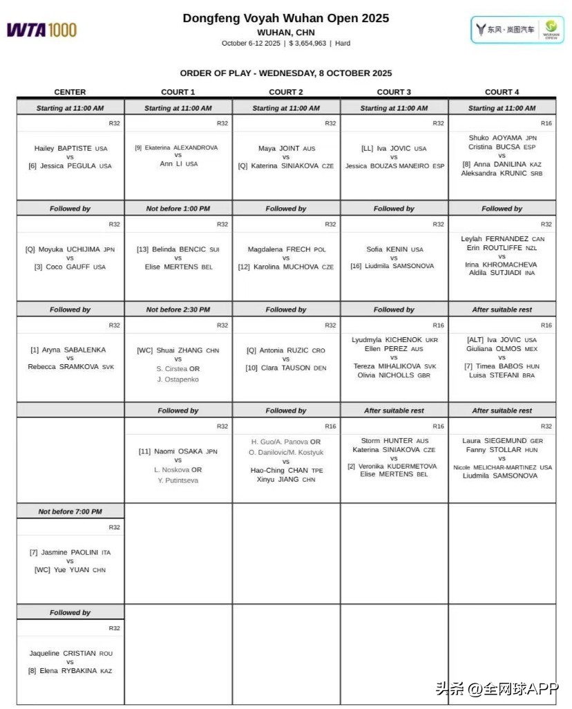 The schedule for October 8th is released. Sixth seed Pegula, two-time Grand Slam champion Gauff, and tournament triple crown holder and current world No.1 Sabalenka will make their Wuhan Open debuts at the center court daytime session. The spotlight night match will feature Chinese player Yuan Yue against 7th seed Paolini. Eighth seed Rybakina will close the night session against Romanian player Cristian. Zhang Shuai will appear on Court 1, competing with Kostia for a spot in the round of 16.