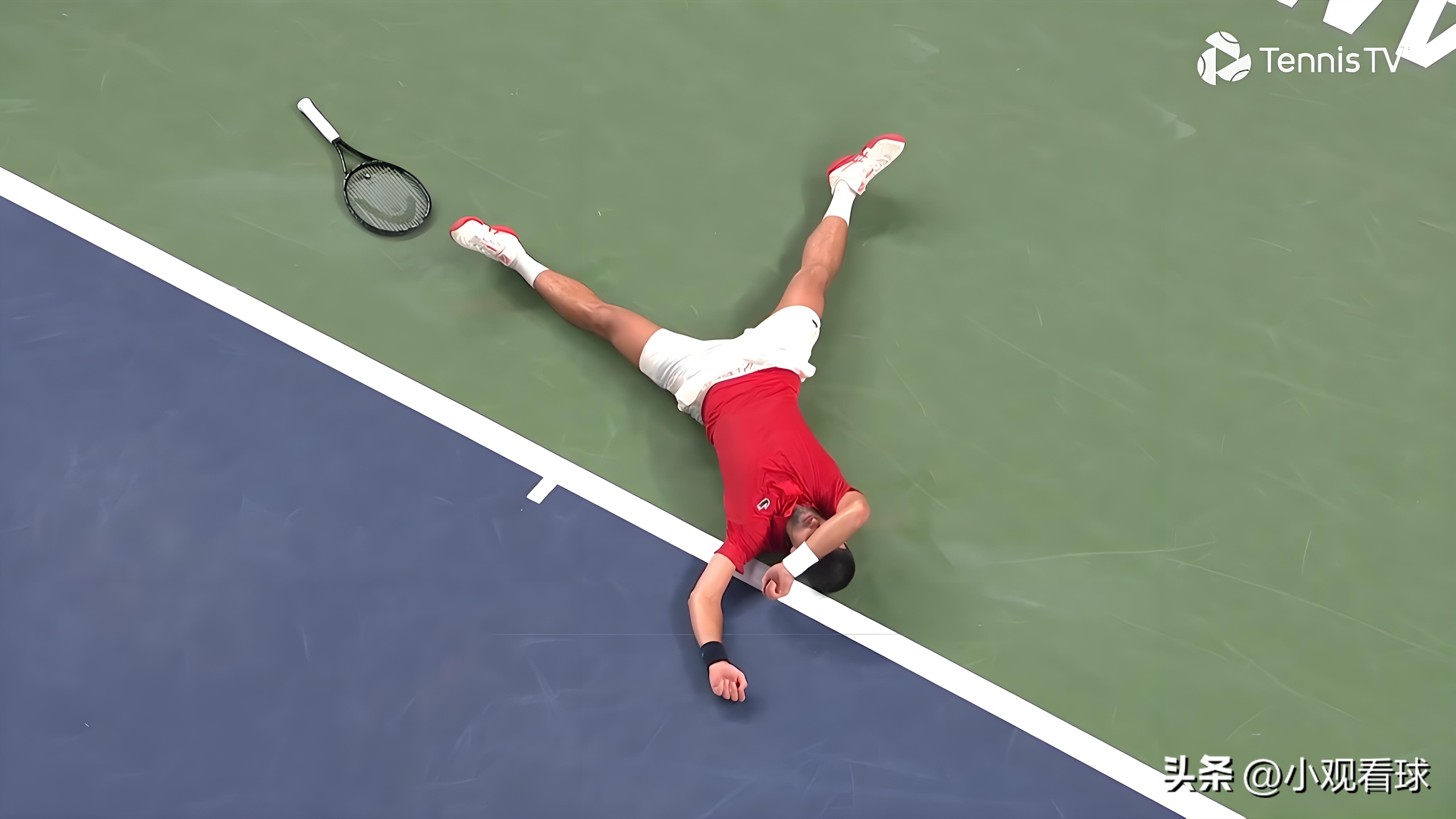 德約科維奇在激烈的第二盤最後一球失誤後,直接癱倒在場上。那是一個多拍回合,這位38歲的老將全場奔跑搶救球,最終一擊失誤。