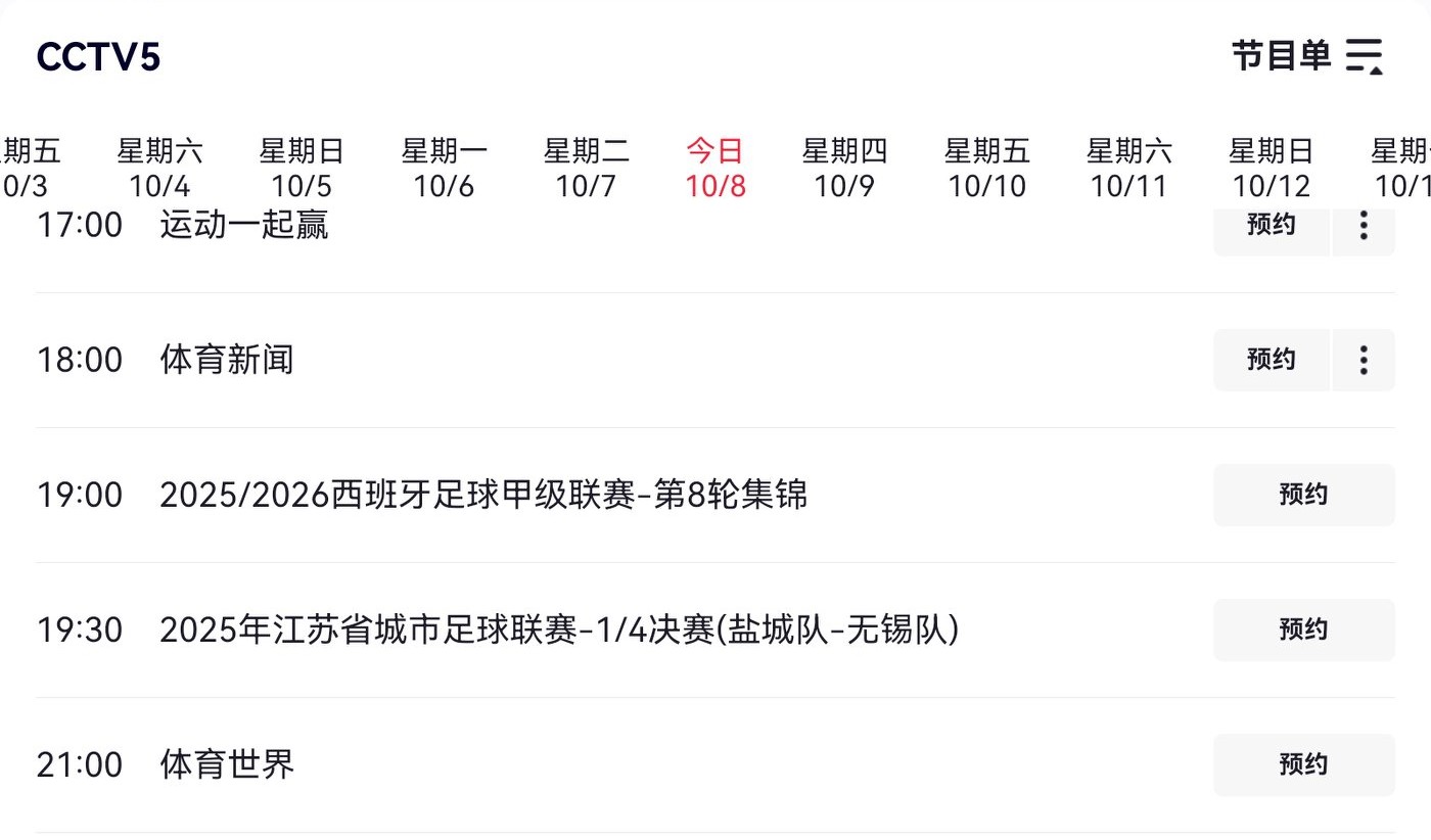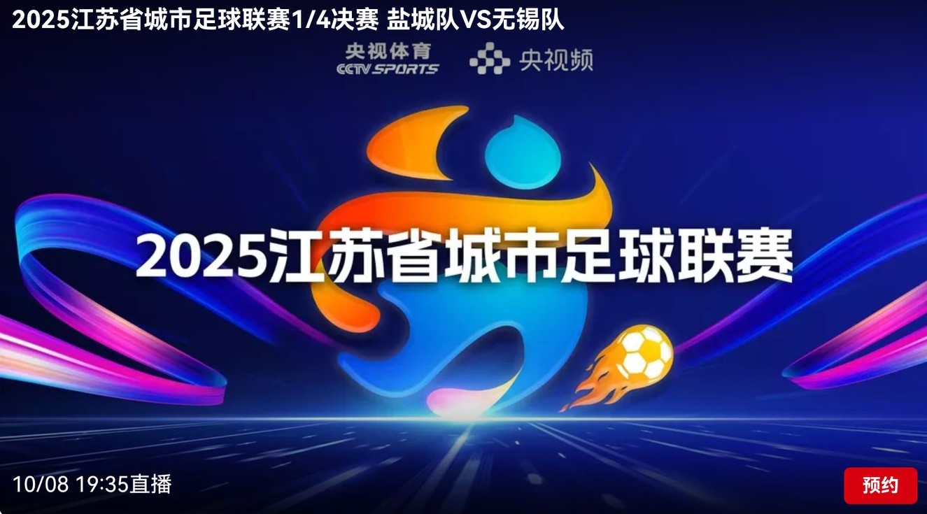 The Scottish Premier League quarterfinal match today (October 8, 2025) is Yancheng versus Wuxi, live on CCTV-5.