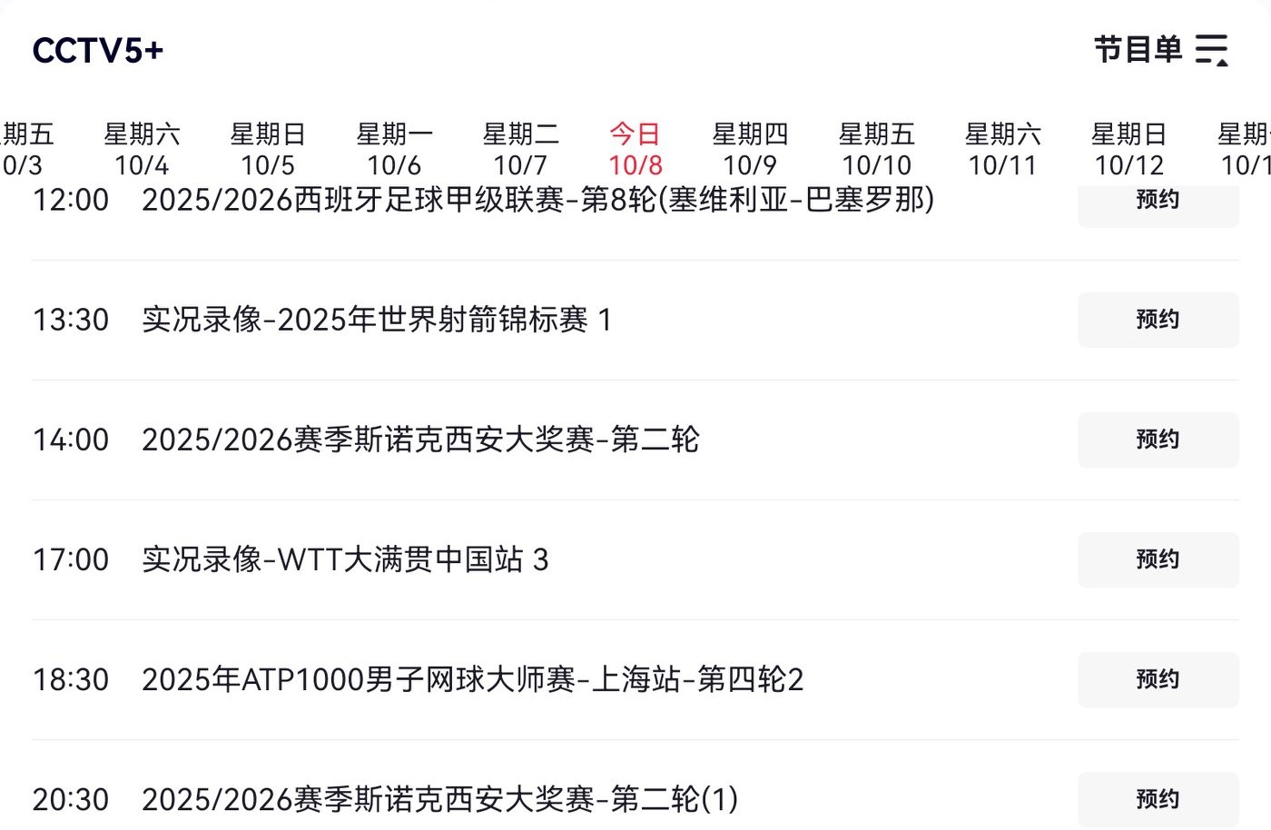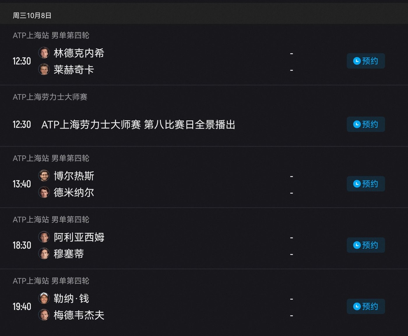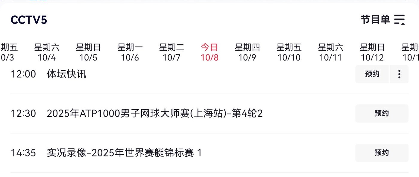 The Shanghai Masters schedule for today (2025.10.8) includes Medvedev, Lindnerknech, Deminal, and others, with live broadcasts on CCTV-5 and Youku Sports Channel.