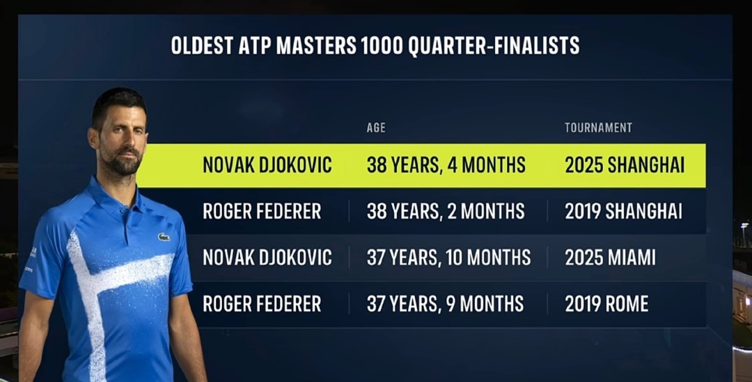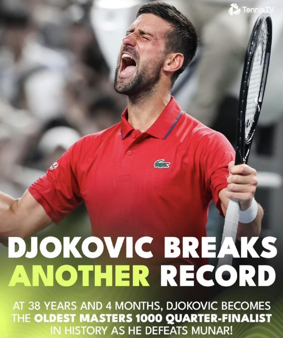 Moreover, this hard-fought win earned Djokovic, at 38 years and 133 days old, the distinction of being the oldest player to reach a Masters quarterfinal, surpassing Federer’s previous record of 38 years and 60 days.