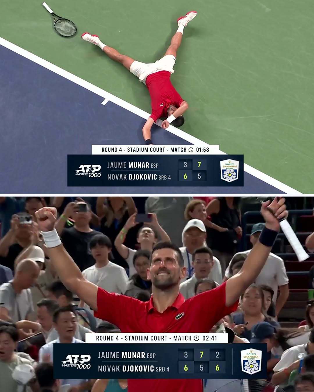Last night, at the end of the second set in the fourth round match of the Shanghai Masters between Djokovic and Munar, the Serbian tennis star collapsed onto the hard court at the Qizhong Tennis Center, drenched in sweat, seemingly too exhausted to get up. Nearly everyone witnessing this moment believed his journey in the Shanghai Masters was about to end.