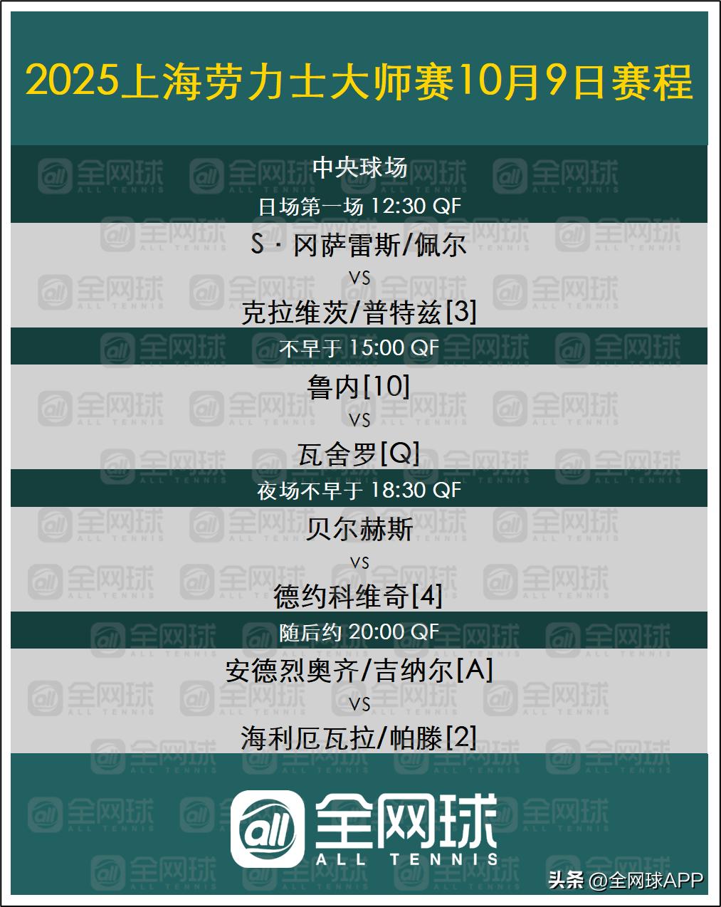 The Day 9 schedule for the 2025 Shanghai Rolex Masters has been announced, with quarterfinal clashes set for men's singles and the lower half of the men's doubles bracket. Third seeds Krawietz and Puetz will kick off on the main court against S. Gonzalez and Per; following that, 10th seed Rune will face Monaco’s Vacherot, who has impressively won seven straight matches through qualifying, posing a serious challenge to the Dane.