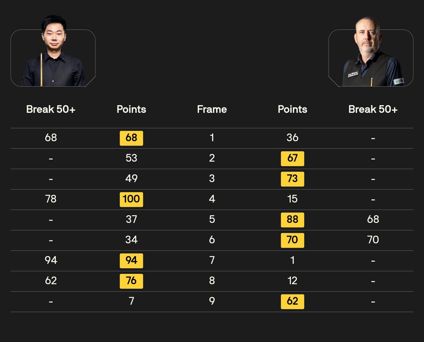 Today’s quarterfinal saw Lu Haotian save two match points consecutively but ultimately lose. Lu took the first frame, followed by Williams winning two in a row to lead 2-1. Lu then fought back to even the score at 2-2. Williams responded with another pair of frames, moving ahead 4-2. Lu rallied again, winning two frames to tie at 4-4. In the deciding frame, Williams seized the opportunity and won 5-4 to advance to the semifinals. Although Lu Haotian lost to Mark Williams in such a close match, his performance was commendable!