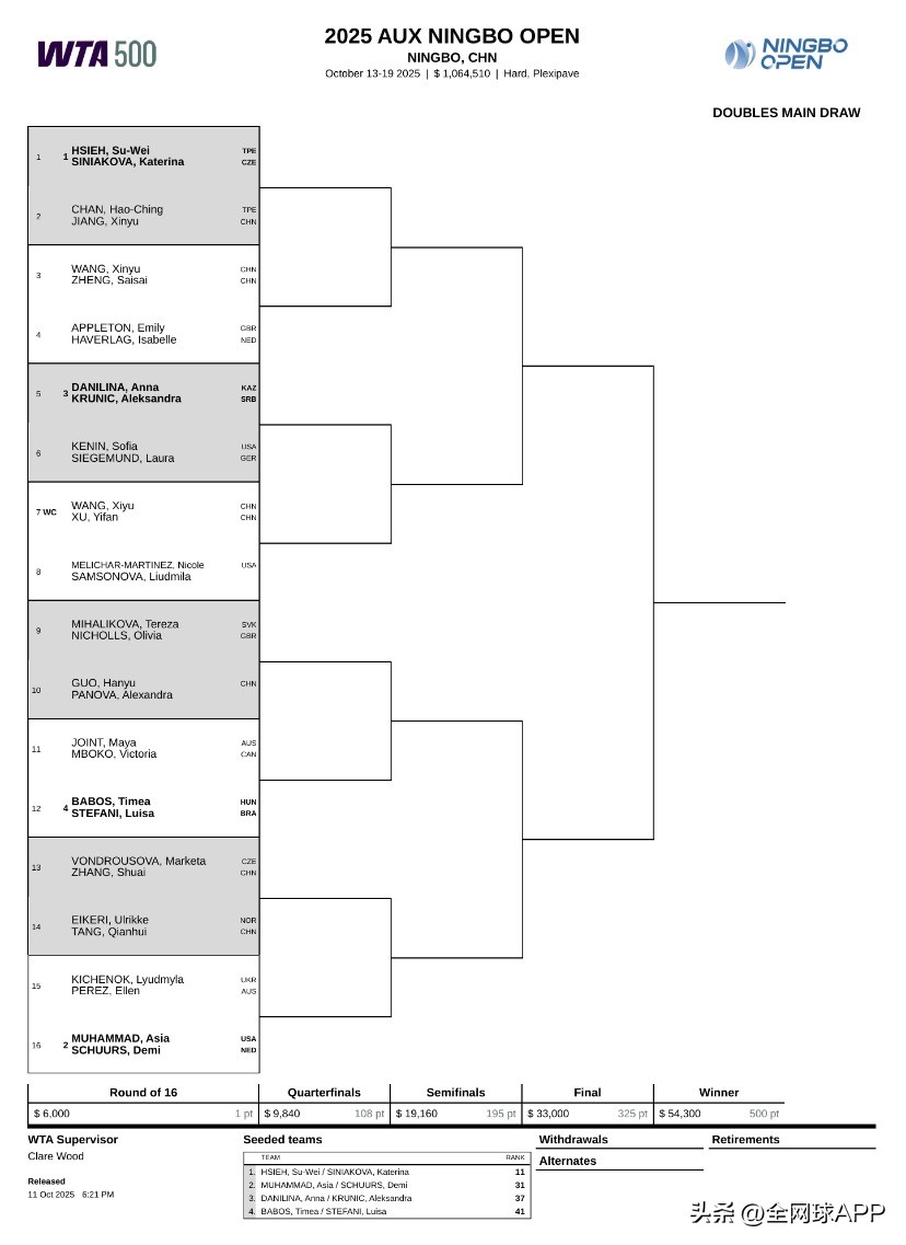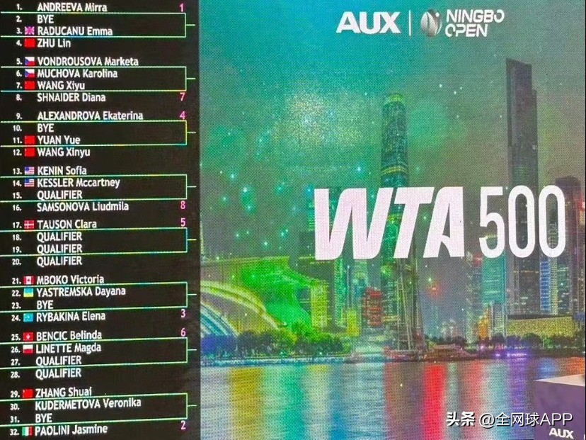 The 2025 WTA500 Ningbo draw was unveiled on October 11th Beijing time. Andreyeva leads as the number one seed, followed by Paolini and Rybakina as the second and third seeds. These three athletes will battle in this tournament to secure their places at this year’s Riyadh WTA Finals.