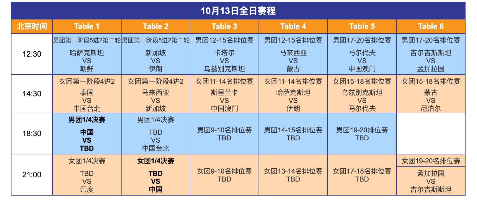The full schedule for today's Asian Table Tennis Team Championships is detailed in the image below.