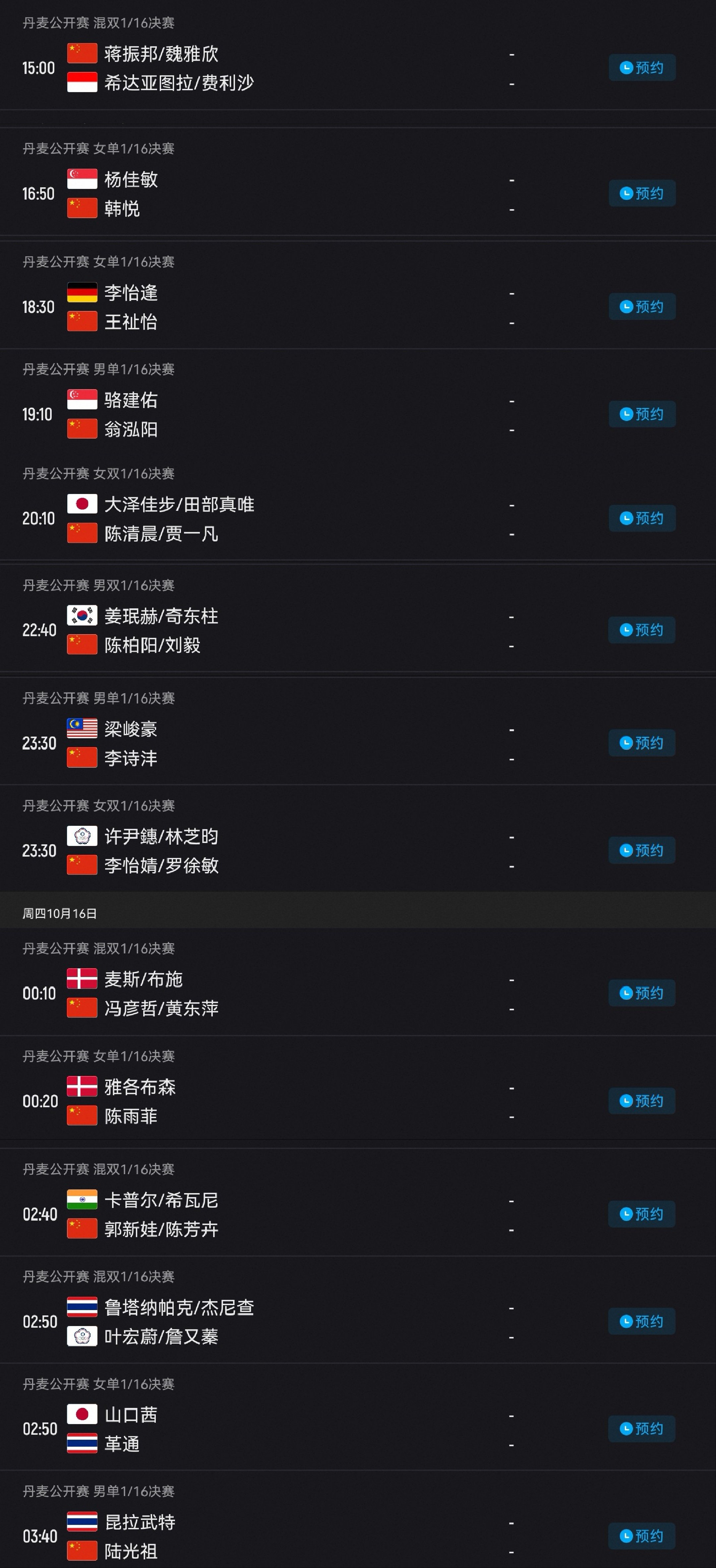 The Denmark Open badminton tournament schedule for today (10.15) features 12 matches with Chen Yufei and other Chinese players competing, live on Youku.