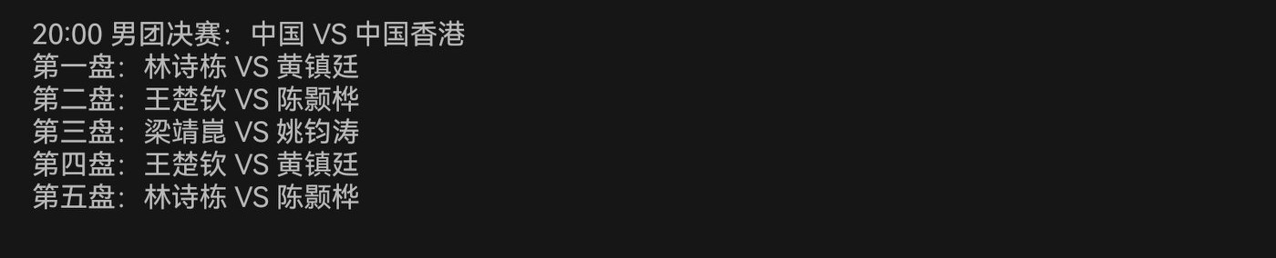 Additionally, the men's team final will start at 8 PM tonight, with China facing Hong Kong. The matchup details are shown in the image below. China is highly likely to defend their title with a 3-0 victory over Hong Kong!