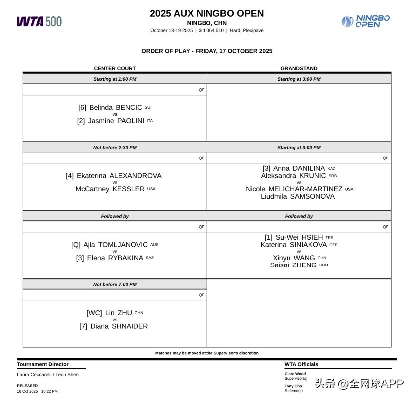 Tomorrow’s women’s singles quarterfinals will take place sequentially on the center court. Starting at 13:00 Beijing time, the match between Paolini and Bencic will kick off; Aleksandrova versus Kessler will follow; and Rybakina will play Tomjanovic in the third match. Chinese player Zhu Lin will close the session on center court, facing 7th seed Schneider for a semifinal spot. Additionally, the Chinese duo Wang Xinyu and Zheng Saisai will compete on the grandstand court aiming for a women’s doubles semifinal berth.