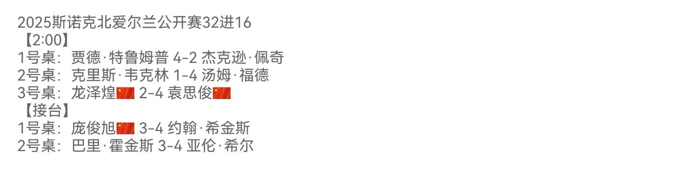 1. Long Zehuang advanced directly to the last 32 due to an opponent's withdrawal in the first round, but was defeated by Yuan Sijun in the round of 32 to 16 this morning. Between the two, Yuan Sijun demonstrated superior skills and won the match. Congratulations to Yuan Sijun for advancing to the next round first.